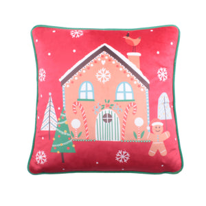 A happy dancing gingerbread man welcomes you into his house on this Christmas cushion from Fusion. Printed on to an incredibly soft touch, plush, fleece fabric. This piped cushion will look great in any room.