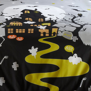 Trick or treat yourself and have a Happy Halloween with this wicked glow in the dark bedding. Printed on to an easy care poly cotton fabric, this duvet set featuring a haunted house will ensure you have a spookacular bedtime.