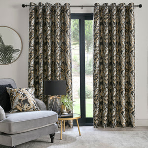 Dress your home in unparalleled elegance with these stunning, fully lined curtains from the Laurence Llewelyn-Bowen collection. They are adorned with gold jacquard palm leaves on a black background that are sure to elevate your space with opulent sophistication. The curtains feature an eyelet heading style which means they are simple to hang and drape beautifully