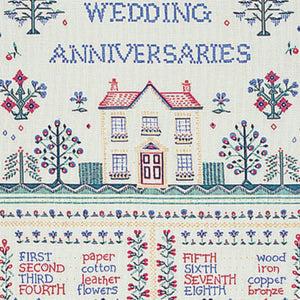 Inspired by embroidery and cross stitch patterns, this delicate design names each important Wedding Anniversary and the material that it symbolises. The main colours used are blue, green and red.