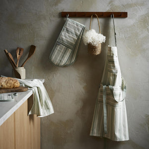 A woven multi-width stripe in sage green and natural cotton shades. An industrial inspired design, enhanced with small, stylish details like double stitched edges and brass rivets on display. A thoughtfully placed pocket at the top of the apron holds your phone in place while two differently sized pockets are ideal for keeping your cooking utensils to hand. The perfect gift for serious chefs and budding bakers alike.