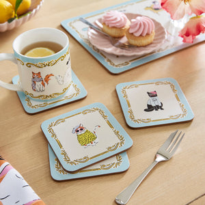Cool Cats draws inspiration from 60s fashion, featuring a kitschy and fun design with vibrant pops of pink and yellow. The playful imagery showcases mischievous cats dressing up and enjoying themselves, capturing the lively spirit of the era while adding a whimsical touch.