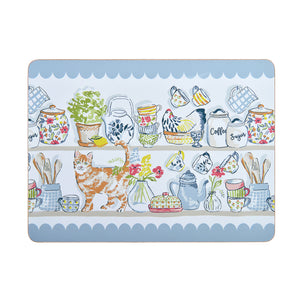 Inspired by a traditional cottage pantry, this design showcases shelves lined with cooking utensils, cookbooks, ceramics, and quirky finds. Playfully incorporating the mischievous nature of cats weaving around countertops, it is hand-painted using watercolours and pen. Gingham and floral borders complete the look, evoking a charming cottagecore aesthetic.