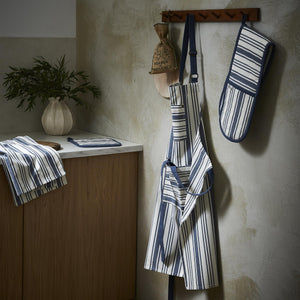 A woven multi-width stripe in denim blue and natural cotton shades. An industrial inspired design, enhanced with small, stylish details like double stitched edges and brass rivets on display. A thoughtfully placed pocket at the top of the apron holds your phone in place while two differently sized pockets are ideal for keeping your cooking utensils to hand. The perfect gift for serious chefs and budding bakers alike.