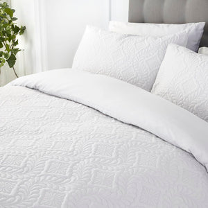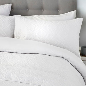 Produced on a soft touch white microfibre fabric using the latest Pinsonic technology to create a three-dimensional raised damask pattern with a plain-reverse. This bedding set will look great in any contemporary bedroom.