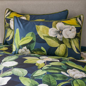 Indulge in the splendour of the Soiree Alaya Duvet Cover Set, where luxury and refinement meet. The front boasts large, exquisite, digitally printed white florals on a deep teal background. Crafted from lush 200-thread count cotton sateen, this set exudes pure indulgence.
